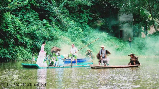 郪江古渡口,古裝舞者在竹筏上表演。(記者 李春梅 王何力 攝影報道)