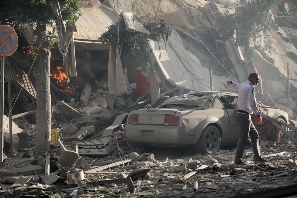 10月3日,在黎巴嫩首都貝魯特,男子指向空襲過后廢墟中的余火。新華社發(fā)(比拉爾·賈維希攝)