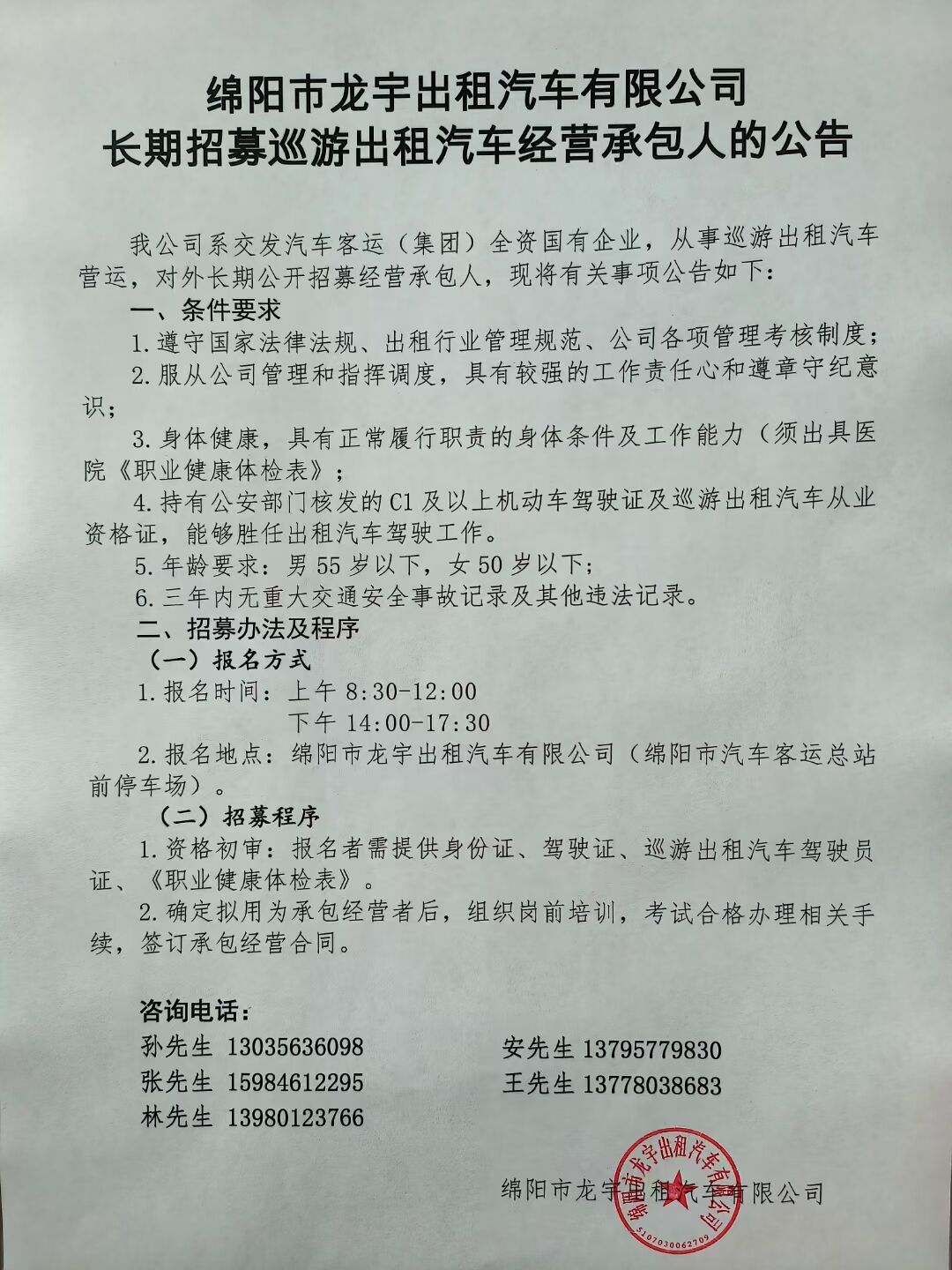 綿陽(yáng)市龍宇出租汽車(chē)有限公司長(zhǎng)期招募巡游出租汽車(chē)經(jīng)營(yíng)承包人,詳情請(qǐng)致電:13035636098、18281951555