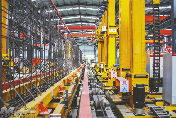 智能鋼筋綁扎生產(chǎn)線上正在焊接馬蹄筋和箍筋