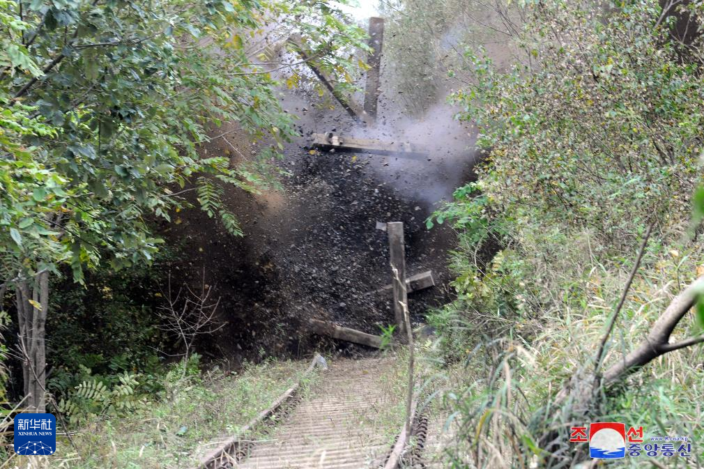 這張朝中社提供的照片顯示的是,朝方以爆破方式封閉鐵路。新華社/朝中社