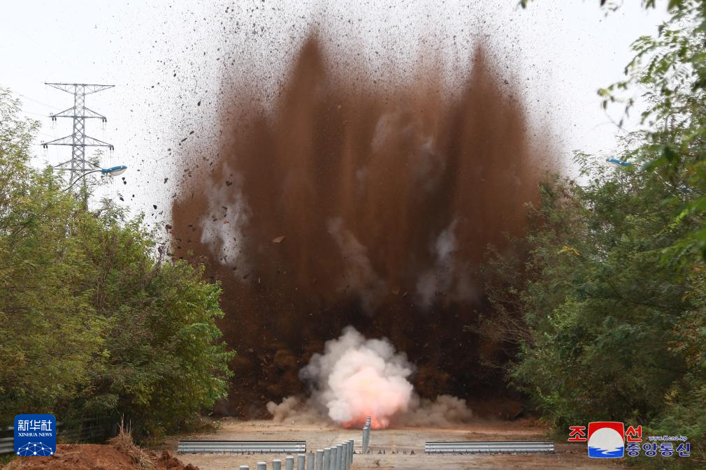 這張朝中社提供的照片顯示的是,朝方以爆破方式封閉公路。新華社/朝中社
