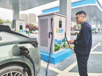 市民在安州區(qū)首個(gè)投用的超級(jí)充電站為車輛充電