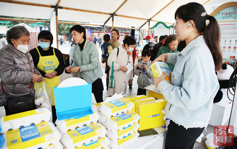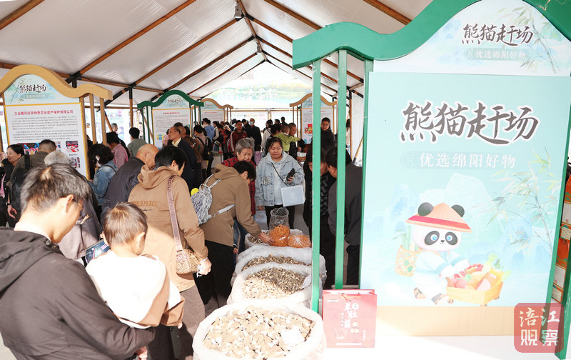 在熊貓趕場(chǎng)館內(nèi),綿陽(yáng)米粉、安州皮蛋、中壩醬油、黃天鵝雞蛋等綿陽(yáng)老字號(hào)、地標(biāo)性農(nóng)特產(chǎn)品香飄四溢;