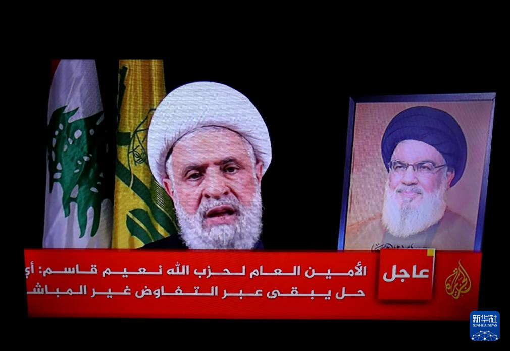 這是10月30日在黎巴嫩首都貝魯特拍攝的黎巴嫩真主黨新任領(lǐng)導(dǎo)人納伊姆·卡西姆(左)發(fā)表講話的電視畫面。新華社發(fā)(比拉爾·賈維希攝)