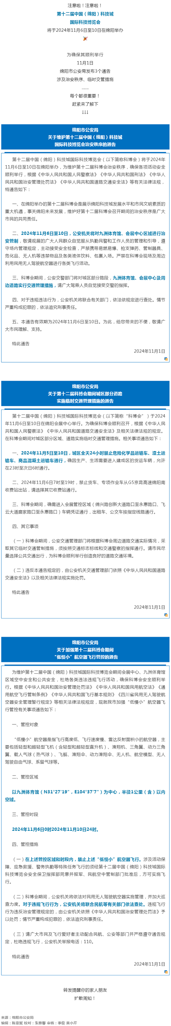 第十二屆中國(綿陽)科技城國際科技博覽會(以下簡稱科博會)將于2024年11月6日至10日在綿陽舉辦,為維護(hù)第十二屆科博會治安秩序,確保各項活動安全順利舉行,根據(jù)《中華人民共和國人民警察法》《中華人民共和國刑法》《中華人民共和國治安管理處罰法》《中華人民共和國道路交通安全法》等有關(guān)法律法規(guī),特通告。