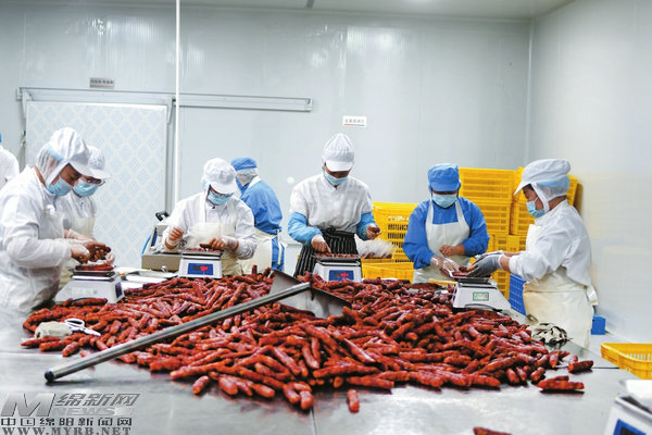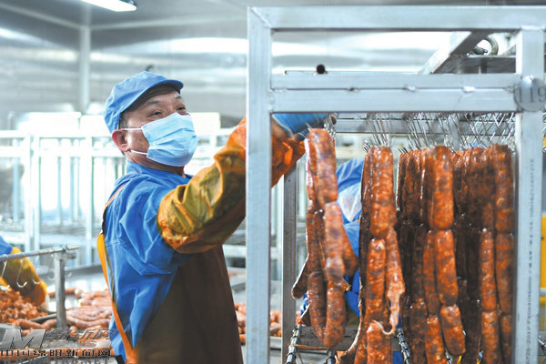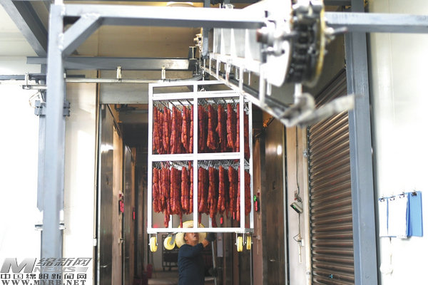 記者在這條生產(chǎn)線看到,豬肉經(jīng)機(jī)械全自動(dòng)解凍清洗后,送入拌料車間,然后抵達(dá)灌裝車間,工人對(duì)香腸進(jìn)行灌制,排氣和整理。灌制好的香腸進(jìn)入烘干房,烘干后再進(jìn)行煙熏,最后是包裝,整個(gè)生產(chǎn)線有序流動(dòng),現(xiàn)場(chǎng)有條不紊,快捷高效。