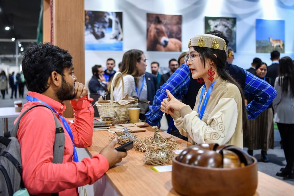 11月11日,在阿塞拜疆首都巴庫(kù),與會(huì)人員在聯(lián)合國(guó)氣候變化巴庫(kù)大會(huì)的一處展館交流。 新華社記者曹陽(yáng)攝