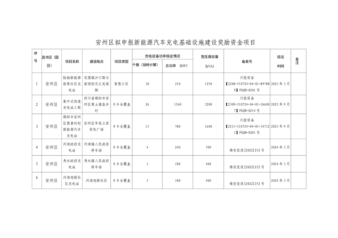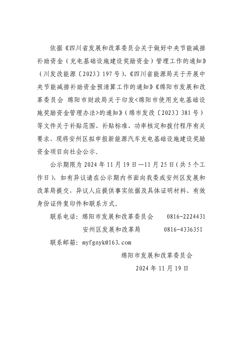 綿陽市發(fā)展和改革委員會關于安州區(qū)擬申報充電基礎設施建設獎勵資金項目的公示