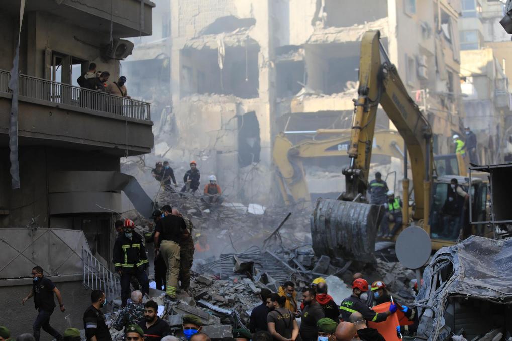 11月23日,在黎巴嫩貝魯特,人們?cè)谠饪找u的建筑廢墟參與搜救。新華社發(fā)