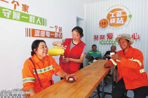冷可取暖、熱可納涼、渴可喝水、累可歇腳。環(huán)衛(wèi)工人、綠化工人等在游仙區(qū)富樂街道工會(huì)驛站喝水、休息。(視覺綿陽資料圖片)