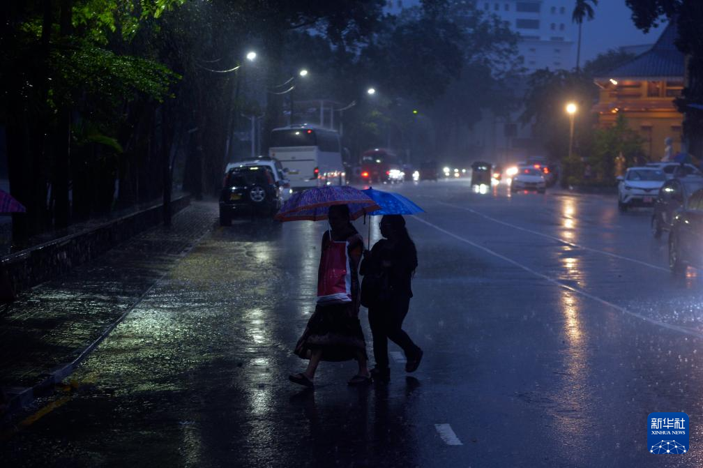 11月26日,在斯里蘭卡科倫坡,人們走過(guò)積水的街道。