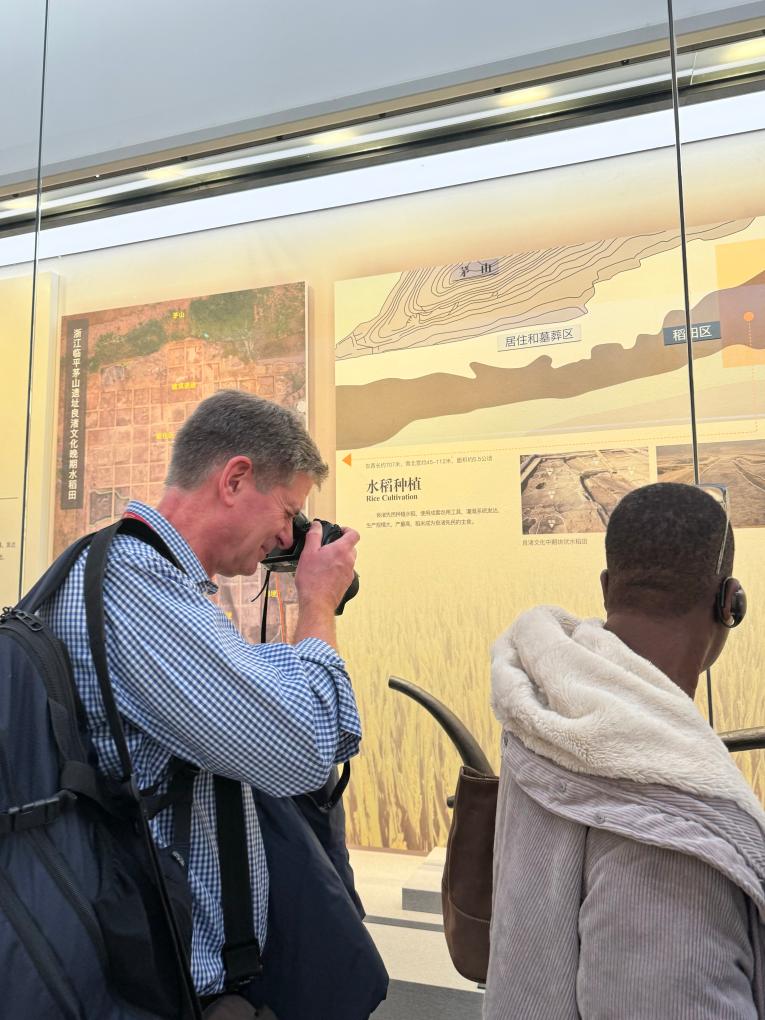 栽培稻、成套農(nóng)用工具、灌溉系統(tǒng)……走進(jìn)位于浙江杭州的良渚博物院,英國杜倫大學(xué)考古學(xué)者羅賓·科寧哈姆頻頻用相機(jī)記錄所見,不放過任何感興趣的細(xì)節(jié)。