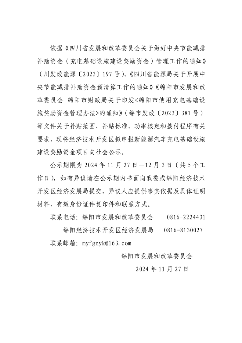 綿陽市發(fā)展和改革委員會關(guān)于綿陽經(jīng)濟(jì)技術(shù)開發(fā)區(qū)擬申報(bào)充電基礎(chǔ)設(shè)施建設(shè)獎勵(lì)資金項(xiàng)目的公示
