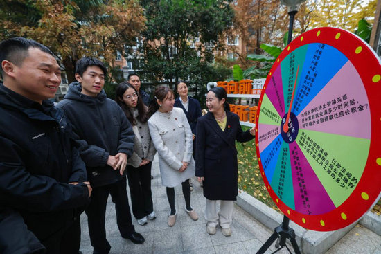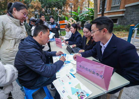 12月4日,在湖州市長(zhǎng)興縣雉城街道所前社區(qū),湖州市住房公積金管理中心長(zhǎng)興縣分中心工作人員(右一)給社區(qū)居民們普及公積金小知識(shí)。