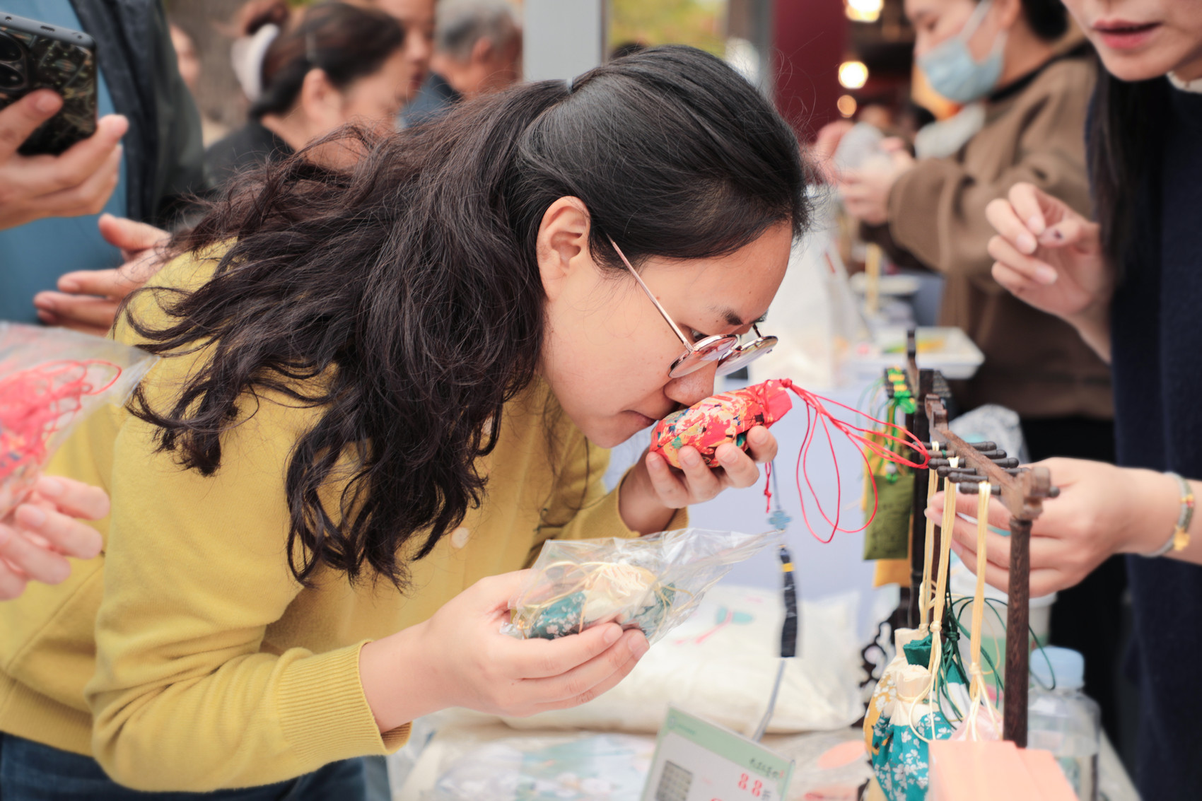 在遂寧的中醫(yī)藥文化夜市上,市民正在體驗中醫(yī)五行香囊。省中醫(yī)藥局供圖