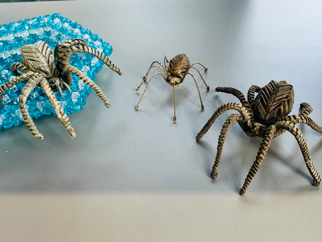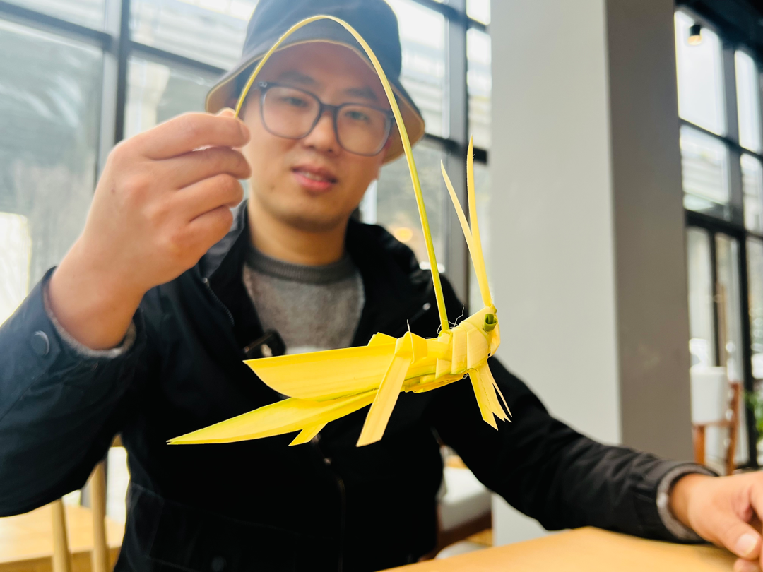 就說編織一只靈動的螞蚱,先挑出柔韌適度的棕葉,溫水泡軟、晾干,讓葉片“溫順聽話”。開工時,將棕葉從中撕開,折出螞蚱的軀干雛形,這一“折”得把控好力度,確保身形勻稱;緊接著,用細(xì)條棕葉穿插、“壓”合,固定腿部與翅膀的位置,稍有偏差,螞蚱就會歪扭不成形;再通過巧妙“穿”針引線,賦予螞蚱細(xì)長觸須與關(guān)節(jié)細(xì)節(jié);收尾時,輕輕“拉”動調(diào)整,讓整體緊湊逼真。為練這一系列動作,李兵反復(fù)揣摩,上萬次的練習(xí),讓他手法愈發(fā)嫻熟。