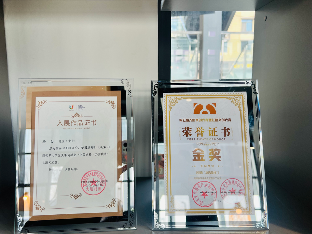技藝漸長,李兵不滿足于傳統(tǒng)。他大膽革新,融入現(xiàn)代審美,給棕編“換裝”:明快色彩打破沉悶,卡通造型萌趣吸睛,還引入鐵絲、彩線加固裝飾,作品迅速走紅。2024年11月,在第五屆四川天府文創(chuàng)大賽中,其精心之作《龍鳳呈祥》斬獲金獎,憑手藝安家養(yǎng)家,家人也一改質(zhì)疑,投來贊許目光。