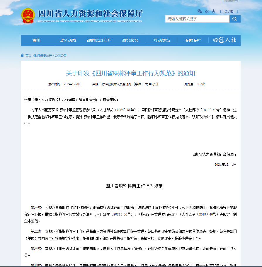 12月11日,川觀新聞?dòng)浾邚乃拇ㄊ∪肆Y源和社會(huì)保障廳了解到,為進(jìn)一步規(guī)范全省職稱評(píng)審程序,提升職稱評(píng)審質(zhì)量,四川省人力資源和社會(huì)保障廳牽頭制定了《四川省職稱評(píng)審工作行為規(guī)范》(以下簡(jiǎn)稱“行為規(guī)范”),采用多種監(jiān)管方式,對(duì)職稱評(píng)審進(jìn)行全過程監(jiān)管,其中重點(diǎn)監(jiān)管申報(bào)人、評(píng)審專家、工作人員、評(píng)審單位和申報(bào)單位行為。同時(shí),建立職稱評(píng)審信用體系,違規(guī)行為將被記入誠(chéng)信檔案庫,影響后續(xù)評(píng)審。評(píng)審單位違規(guī)將被約談、整改甚至收回評(píng)審權(quán)。該“行為規(guī)范”將從明年1月1日起實(shí)施。