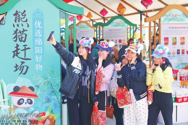 十二月十九日,在綿陽(yáng)市“文化三”推深圳行活動(dòng)熊貓趕場(chǎng)展區(qū),觀眾拍照打卡。(記者陳冬冬攝)