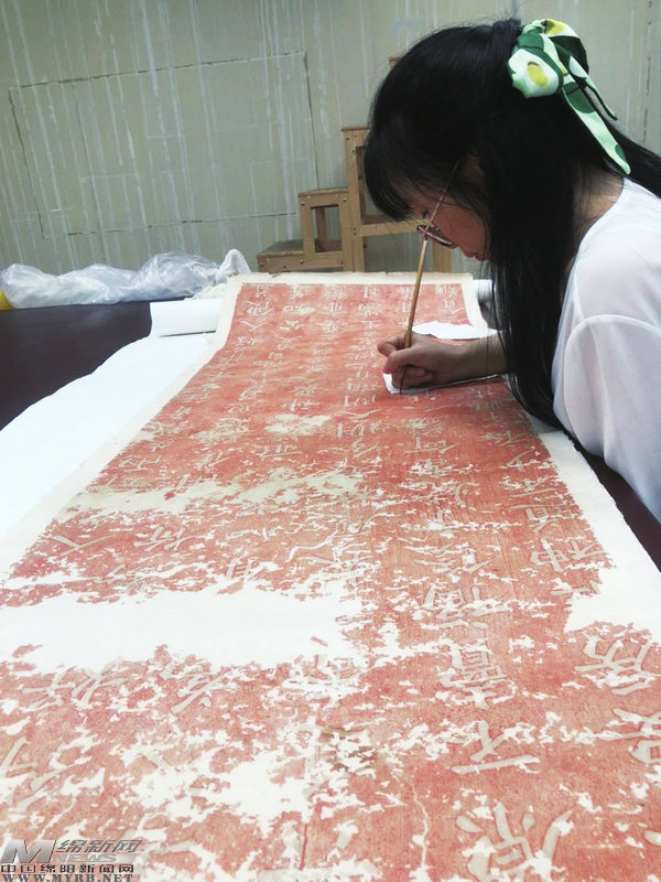 長發(fā)披肩的王靜握著一支小號毛筆,正低頭對案桌上一幅胡雪海的楷書拓片一點點描補。這幅長卷拓片紅底白字,有的字跡已斑駁模糊,有的詞句已完全斷字脫節(jié)。她輕輕用筆尖醮上紅色顏料,再在紅色背底殘缺的地方小心補全。