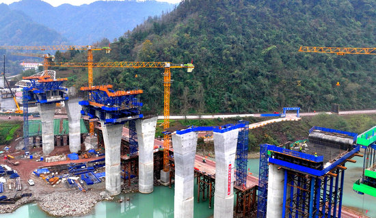 建設(shè)中的西渝高鐵樊噲站1號六線特大橋。中鐵六局西渝高鐵康渝項目部供圖