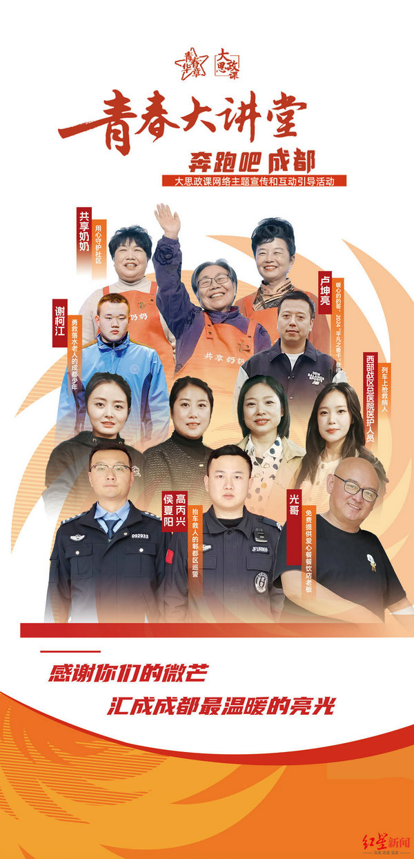 12月27日,“青春大講堂·奔跑吧成都”大思政課網(wǎng)絡(luò)主題宣傳和互動(dòng)引導(dǎo)活動(dòng)將在成都舉行,活動(dòng)邀請(qǐng)來(lái)自航空航天、產(chǎn)業(yè)園區(qū)、科技創(chuàng)新、鄉(xiāng)村振興、運(yùn)動(dòng)賽事、文化傳承等領(lǐng)域的青春榜樣,從他們?yōu)閴?mèng)奔跑的故事出發(fā),串聯(lián)起成都2024年度向前奔跑、向上生長(zhǎng)的城市發(fā)展脈絡(luò),同時(shí)向廣大青少年傳遞“拼搏奮進(jìn)、創(chuàng)新創(chuàng)造、追求卓越、開(kāi)放包容、溫暖友善”的精神。
