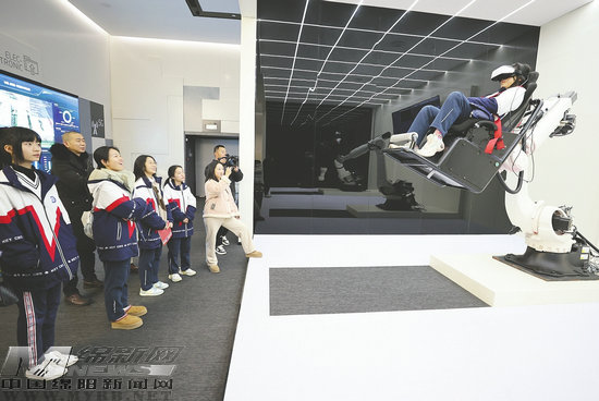 在中國(綿陽)科技城5G科技園,青年們現(xiàn)場體驗趣味交互項目:戴上VR眼鏡,坐在720°翻轉(zhuǎn)機(jī)械臂上徜徉虛擬世界,和智能機(jī)器人一起搖擺跳舞,沉浸式體驗MR技術(shù)。