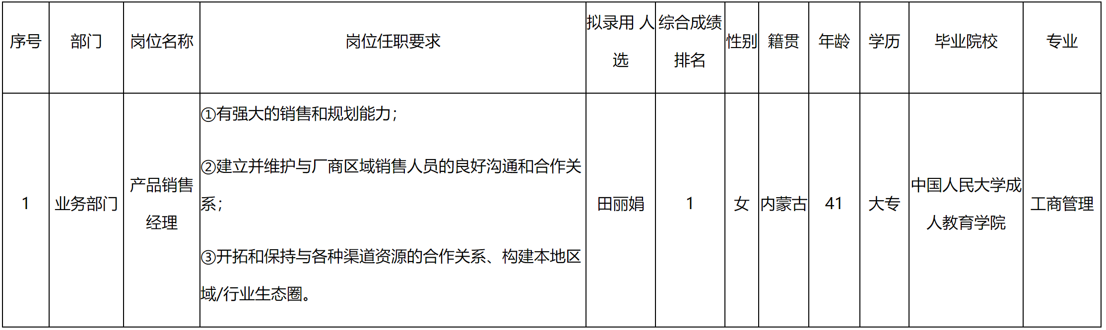 根據(jù)四川長虹佳華信息產(chǎn)品有限責(zé)任公司發(fā)布的招聘公告及招聘相關(guān)規(guī)定,經(jīng)面試、考察、體檢等程序,擬錄用田麗娟同志到四川長虹佳華信息產(chǎn)品有限責(zé)任公司工作,現(xiàn)予以公示,具體情況如下:
