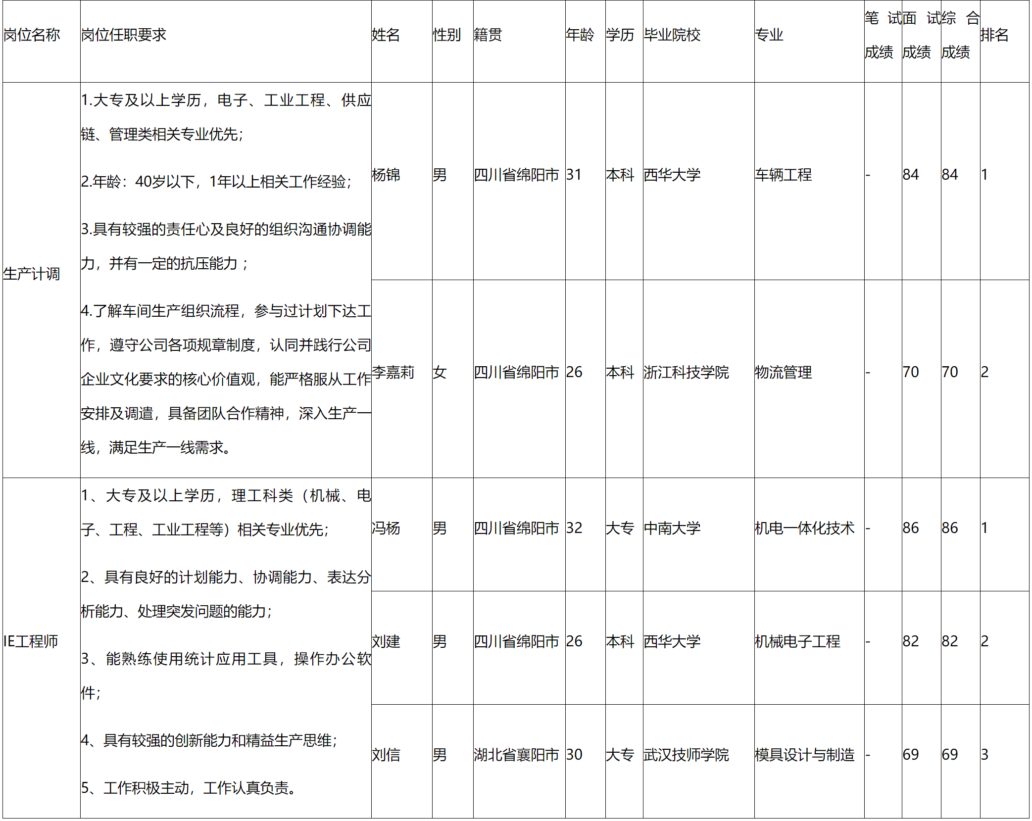 根據四川九州電子科技股份有限公司發(fā)布的招聘公告及招聘相關規(guī)定,經筆試、面試等程序,現將筆試(面試)成績予以公示。