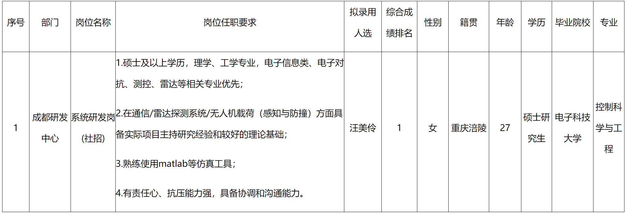 根據(jù)四川九州空管科技有限責(zé)任公司發(fā)布的招聘公告及招聘相關(guān)規(guī)定,經(jīng)筆試、面試、考察、體檢等程序,擬錄用汪美伶同志到四川九州空管科技有限責(zé)任公司工作,現(xiàn)予以公示,具體情況如下: