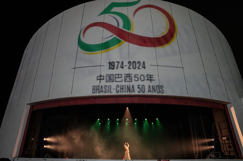 演出過后,五星紅旗、巴西國旗依次亮起,中巴建交50周年的標(biāo)識(shí)出現(xiàn)在觀眾們眼前。