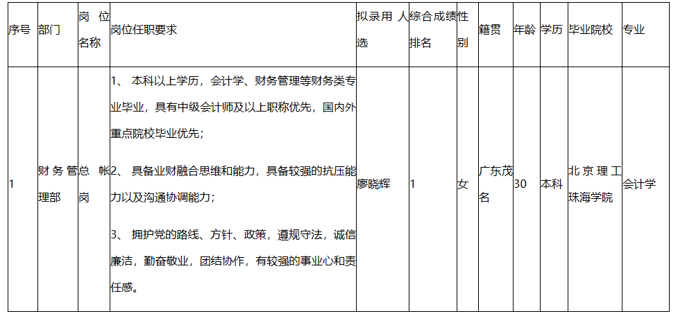 根據(jù)深圳市九州光電子有限公司發(fā)布的招聘公告及招聘相關(guān)規(guī)定,經(jīng)面試、考察、體檢等程序,擬錄用廖曉輝同志到深圳市九州光電子有限公司工作,現(xiàn)予以公示,具體情況如下:
