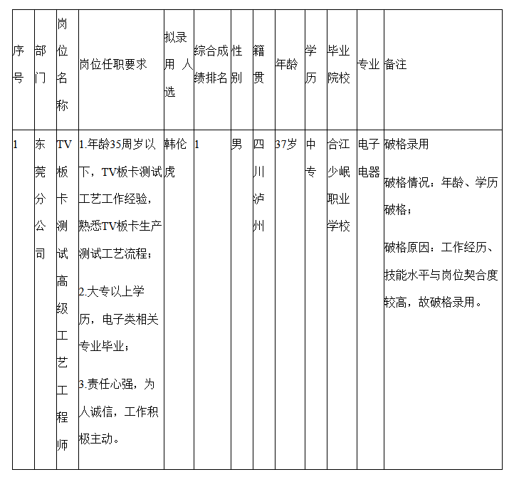 根據(jù)四川愛聯(lián)科技股份有限公司發(fā)布的招聘公告及招聘相關規(guī)定,經(jīng)筆試、面試、考察、體檢等程序,擬錄用韓倫虎同志到東莞分公司任職TV板卡測試高級工藝工程師,現(xiàn)予以公示,具體情況如下: