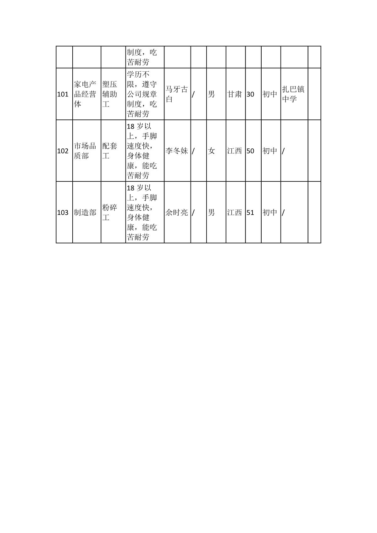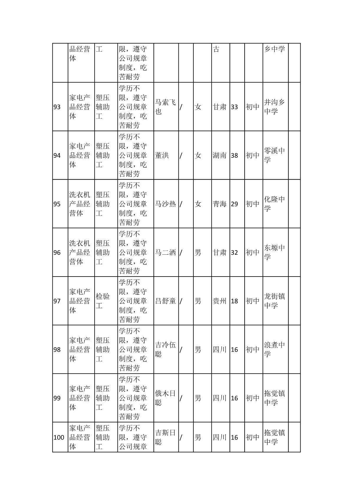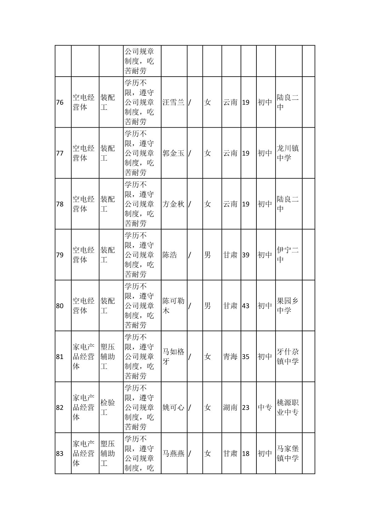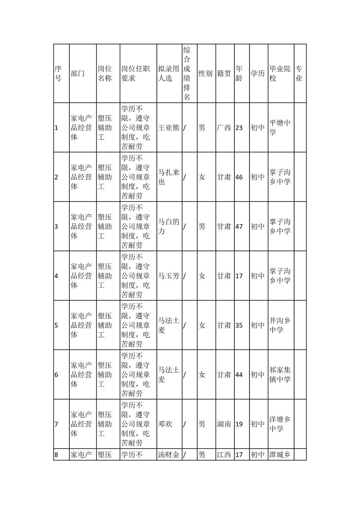 根據(jù)長(zhǎng)虹模塑公司發(fā)布的招聘公告及招聘相關(guān)規(guī)定,經(jīng)筆試、面試、考察、體檢等程序,擬錄用103名同志到長(zhǎng)虹模塑公司工作,現(xiàn)予以公示,具體情況如下: