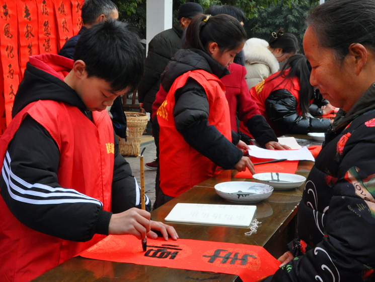 上午 9 點,該校黨支部志愿服務(wù)隊黨員志愿者劉華勇帶領(lǐng)五名紅領(lǐng)巾志愿服務(wù)隊來到桑棗鎮(zhèn)文化廣場,他們紛紛揮毫潑墨,用他們精湛的書法技藝寫下了一幅幅喜慶春聯(lián),一副副寓意美好的春聯(lián)、一張張火紅的“福”字躍然紙上,為社區(qū)居民送上了溫暖的節(jié)日祝福。社區(qū)居民紛紛前來領(lǐng)取這些充滿喜慶和祝福的春聯(lián),他們拿著一副副紅紅火火的春聯(lián)和福字,臉上洋溢著幸福的笑容。