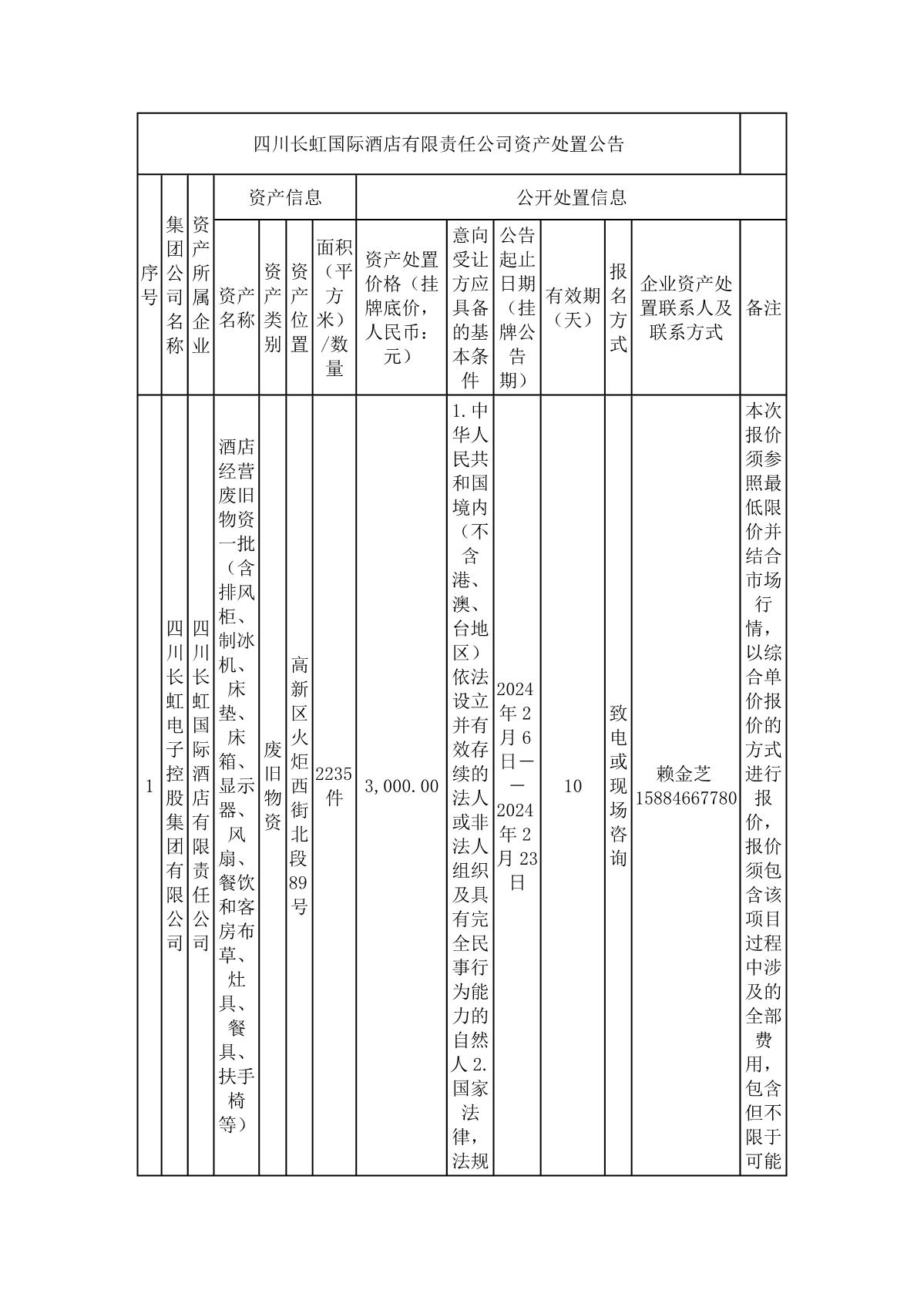 四川長虹國際酒店有限責(zé)任公司資產(chǎn)處置公告