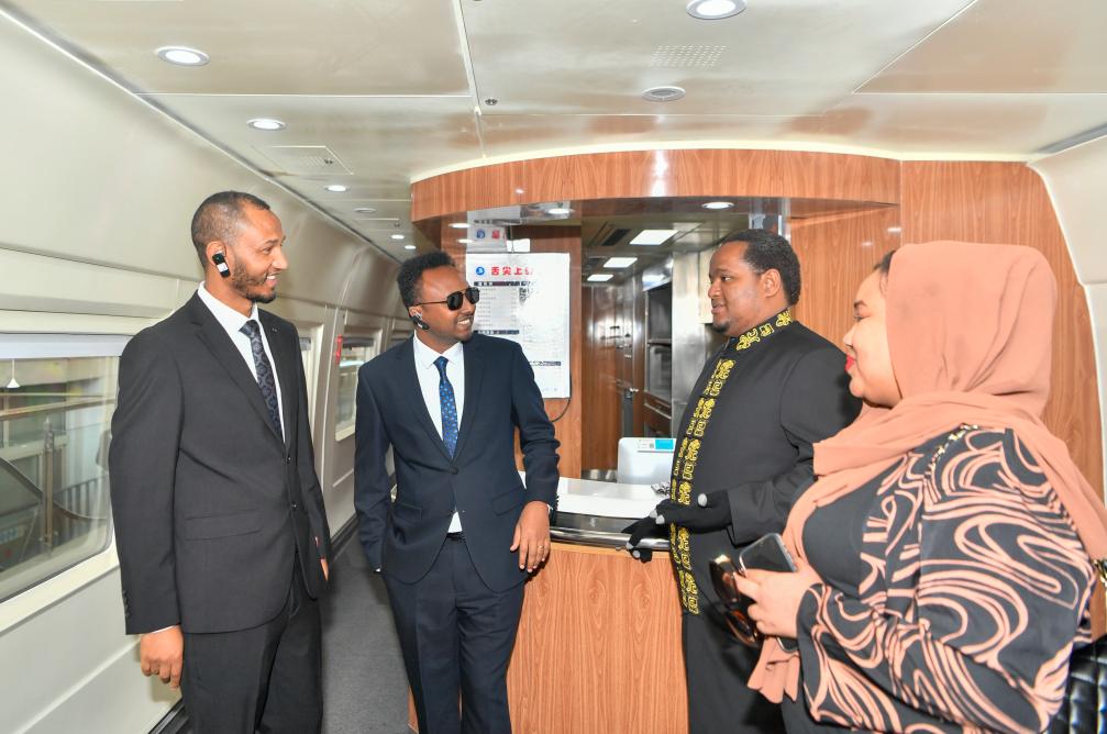 2023年11月7日,首屆亞吉鐵路高層管理人員培訓(xùn)在天津鐵道職業(yè)技術(shù)學(xué)院舉行結(jié)業(yè)儀式。這是結(jié)業(yè)人員在高鐵模擬車廂內(nèi)交談。