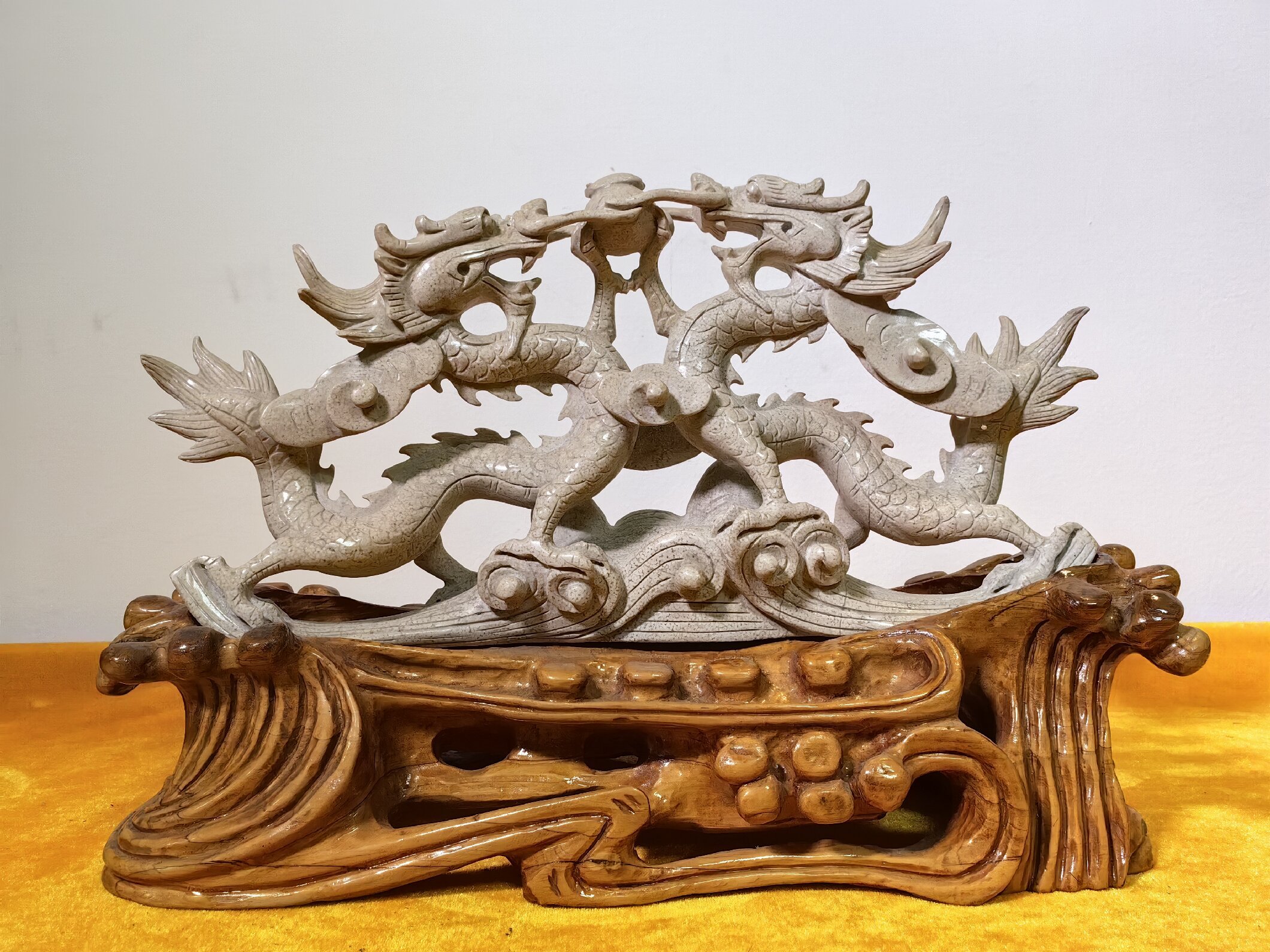 玉龍化石雕刻《雙龍戲珠》