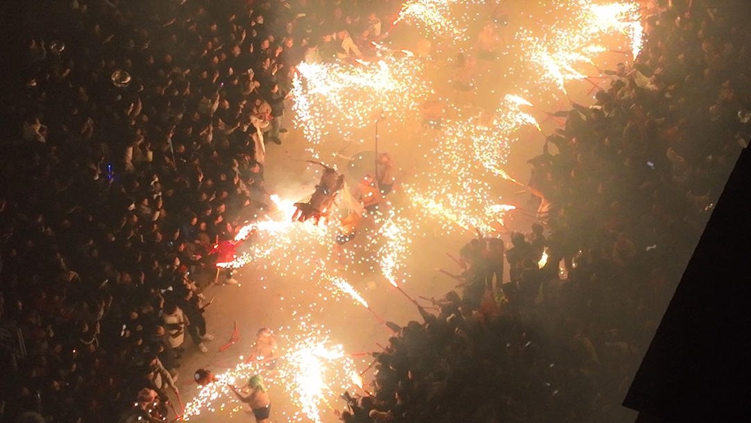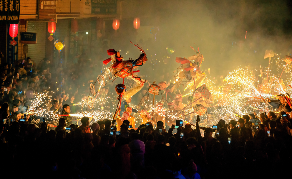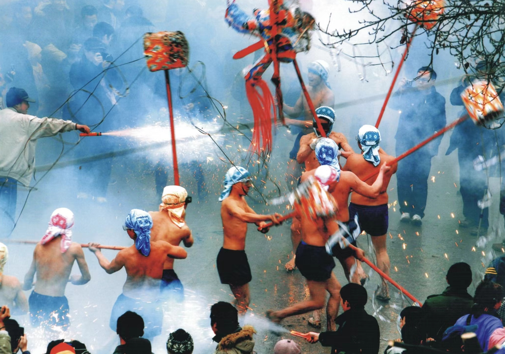 舞龍時(shí),“舞龍人”赤裸上身、頭裹毛巾,“引龍人”手持彩色龍珠,不斷變換招式,逗引火龍時(shí)而翹首仰視,時(shí)而低首回顧,時(shí)而搖頭擺尾……觀賞者用點(diǎn)燃的煙花朝著舞龍隊(duì)噴燒,稱之為“燒火龍”,龍、燈、舞、火焰融為一體,場面極其華美絢麗。煙火燒得越旺,舞龍人越高興,火龍就舞得越起勁,象征著日子越過越紅火。