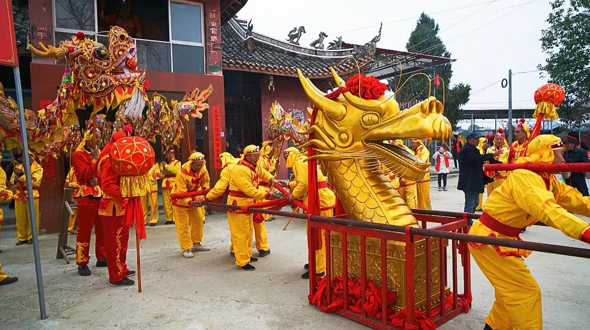 老馬鎮(zhèn)“龍?zhí)ь^節(jié)”儀式感滿滿,首先要進(jìn)行請(qǐng)龍儀式。村民們穿著盛裝,聚集在老馬鎮(zhèn)龍頭山山頂,在金色龍頭前高喊請(qǐng)龍祝詞:“請(qǐng)龍咯!請(qǐng)龍咯!”在“請(qǐng)龍”呼聲中,8名村民抬起碩大的金色龍頭,走在巡游隊(duì)伍前,沿龍頭山至老馬場(chǎng)鎮(zhèn)進(jìn)行巡游,祈盼風(fēng)調(diào)雨順、五谷豐登、倉(cāng)滿廩實(shí)。
