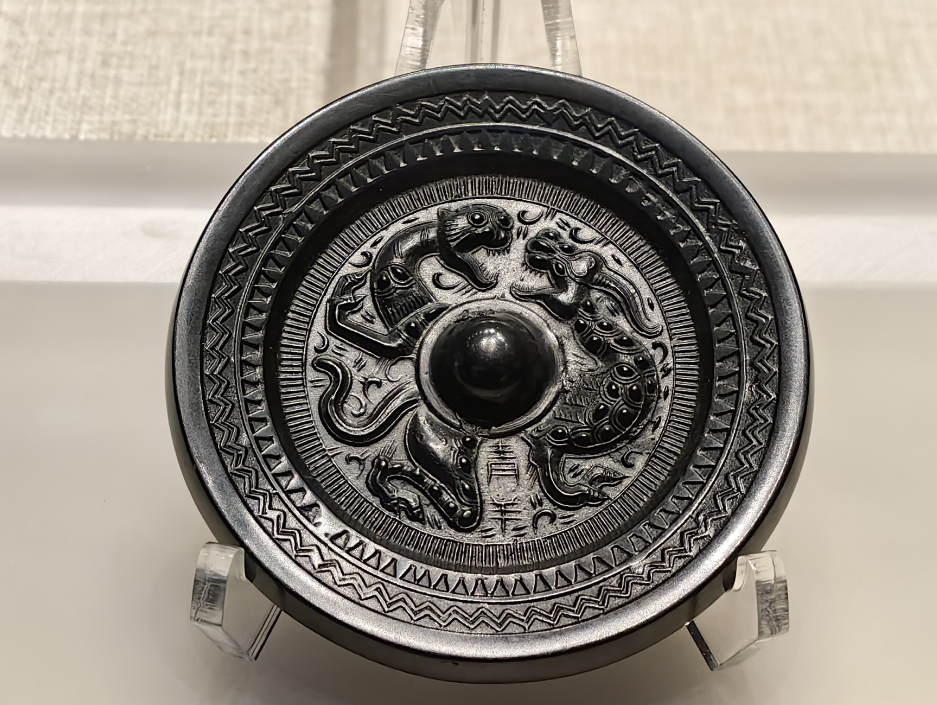 在綿陽市博物館展廳,陳列著一件1996年出土于綿陽市游仙區(qū)原白蟬鄉(xiāng)朱家梁子的神獸黑漆古銅鏡。這件銅鏡直徑9.58厘米,緣厚0.7厘米,中心厚1.03厘米。銅鏡呈圓形,鏡背中心有一圓鈕座,鈕座外裝飾了一圈神獸紋,一龍一虎,張口露齒,好像在對峙。二獸的尾部以隸書銘刻“青羊”二字。神獸外區(qū)一圈為短直線紋,緣上兩周紋飾,內(nèi)為鋸齒紋,外為雙線波折紋。
