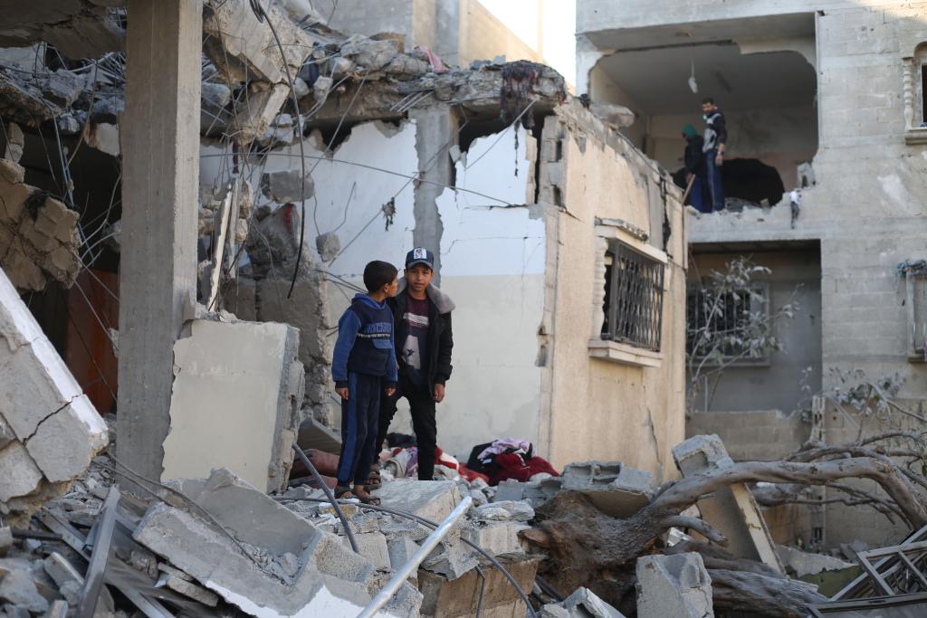 2月21日,在加沙地帶南部城市拉法,巴勒斯坦人查看以軍空襲后的廢墟。新華社發(fā)(哈立德·奧馬爾攝)