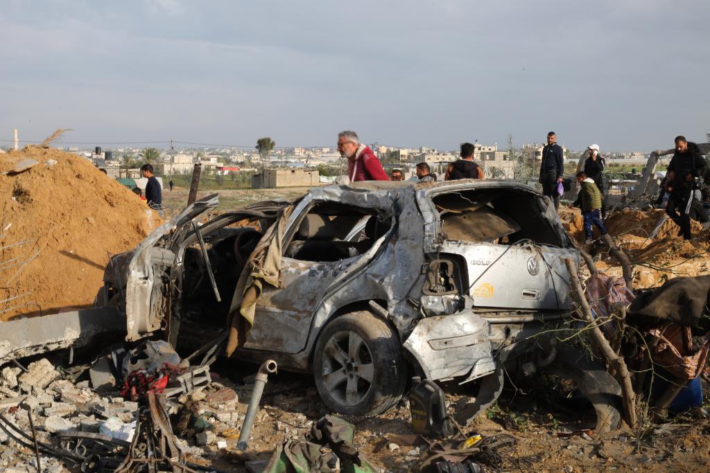 2月18日,在加沙地帶南部城市拉法,巴勒斯坦人查看以軍空襲后的損毀情況。新華社發(fā)(哈立德·奧馬爾攝)