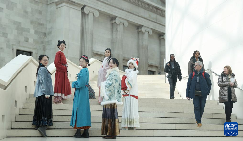 2月25日,漢服愛好者在英國(guó)倫敦大英博物館展示漢服。