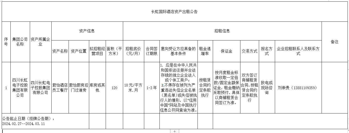 長(zhǎng)虹國(guó)際酒店資產(chǎn)出租公告