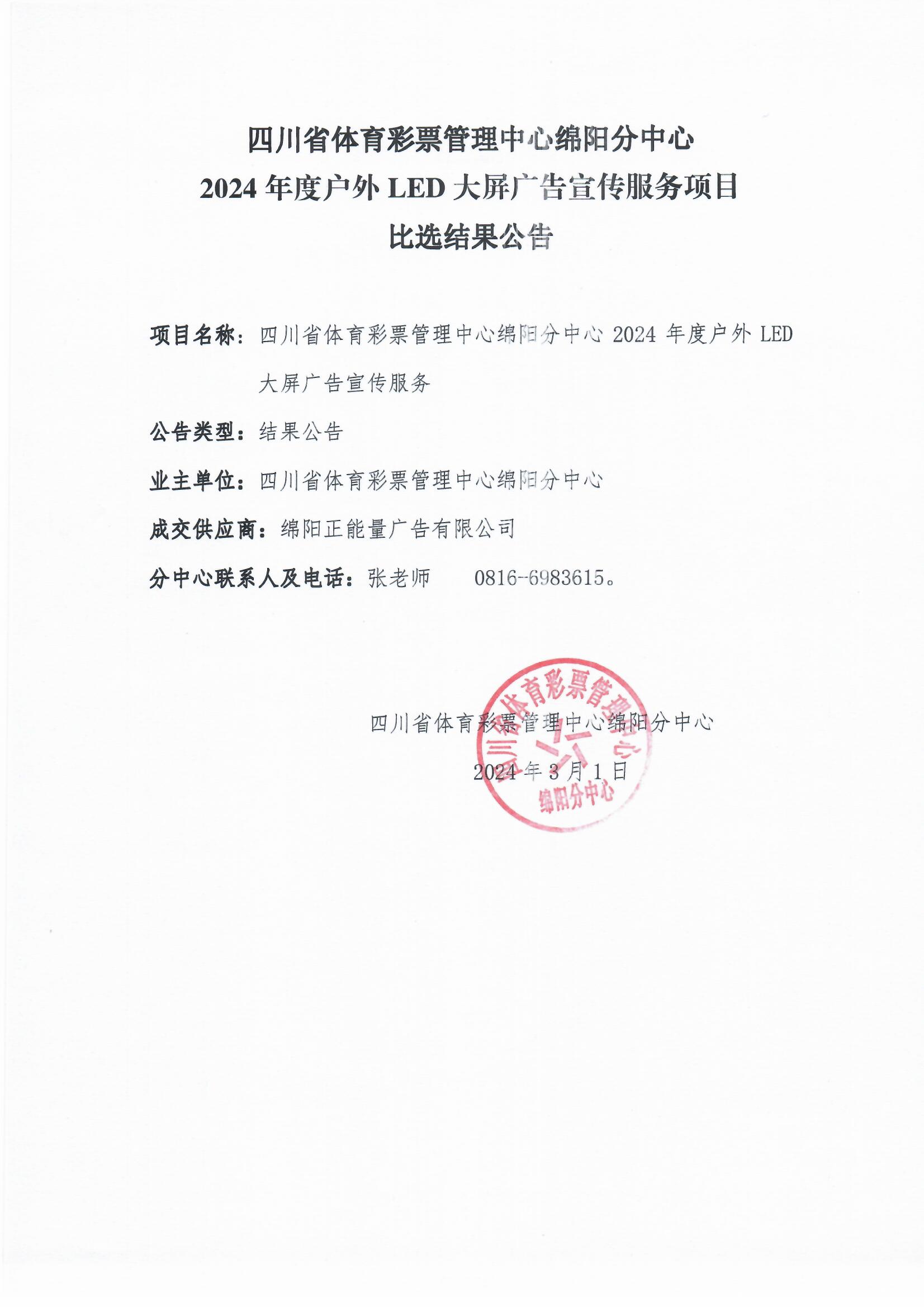 四川省體育彩票管理中心綿陽分中心2024年度戶外ED大屏廣告宣傳服務(wù)項目比選結(jié)果公告