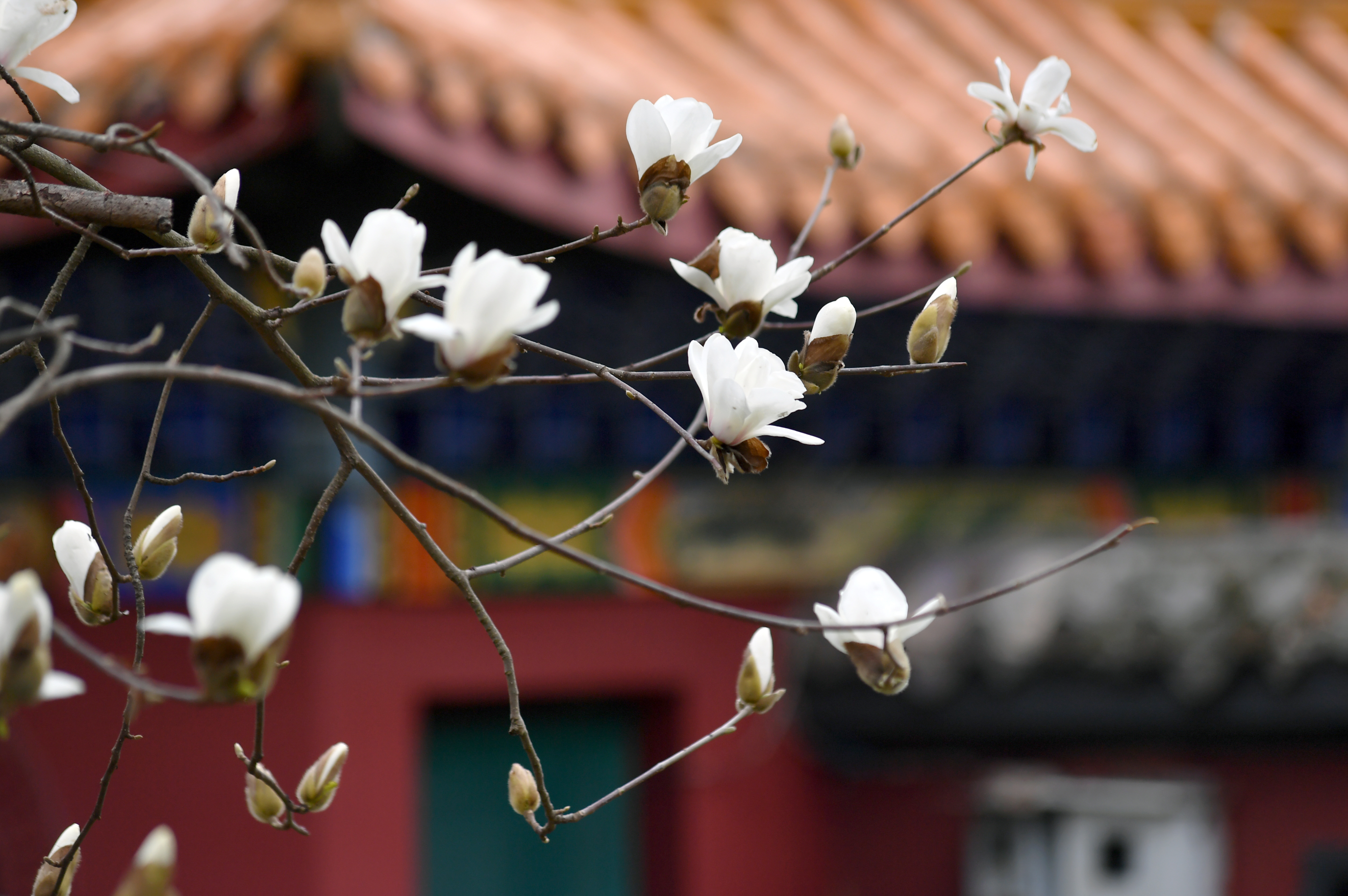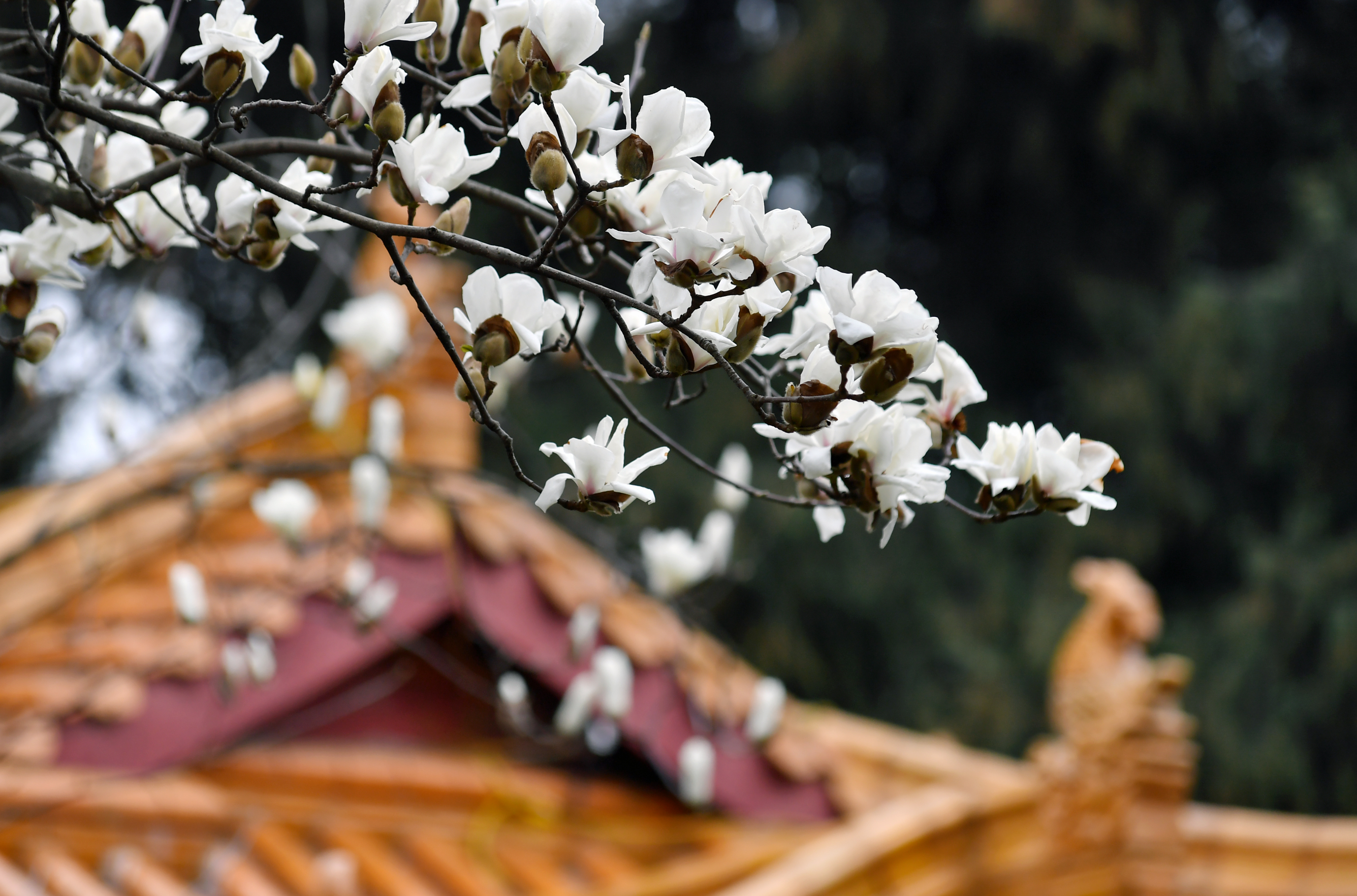 在富樂山,一朵朵潔白碩大的玉蘭花與古香古色的紅墻黃瓦、飛檐脊獸相互映襯,呈現(xiàn)出一幅韻味十足的詩(shī)意美景圖,吸引了許多市民觀賞和拍照。