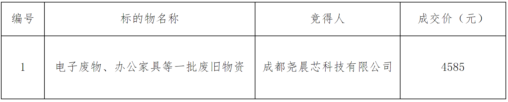 經(jīng)綿陽市財政局批準(zhǔn),我中心于2024年3月5日在綿陽市公共資源交易電子交易系統(tǒng)網(wǎng)上競價方式公開處置“電子廢物、辦公家具等廢舊物資”一批,現(xiàn)將成交結(jié)果公示如下: