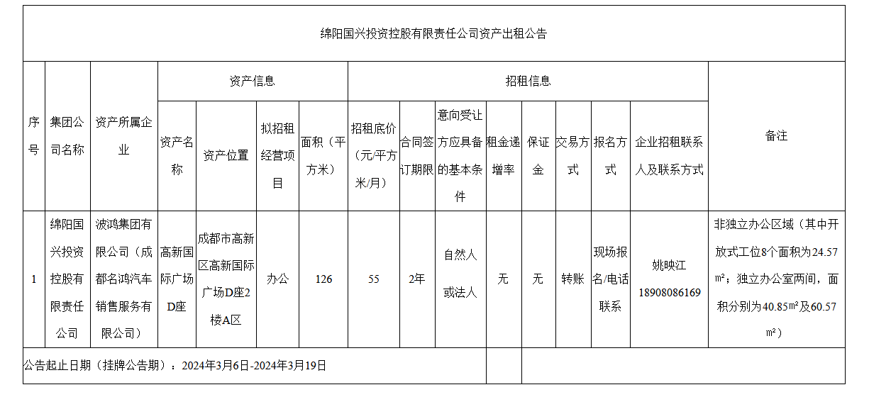 綿陽國興投資控股有限責(zé)任公司資產(chǎn)出租公告